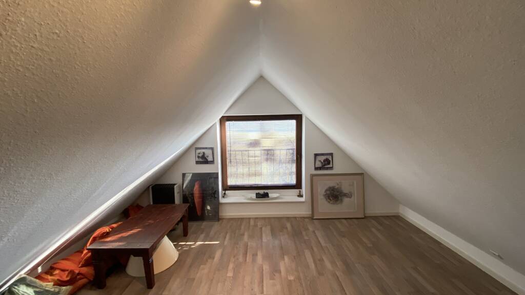 Der ausgebaute Spitzboden - etwa 18 m² nach WoFIV groß - bietet einen abgeschlossenen Studioraum sowie einen davor gelagerten Empore-Bereich, bestens als Homeoffice geeignet.