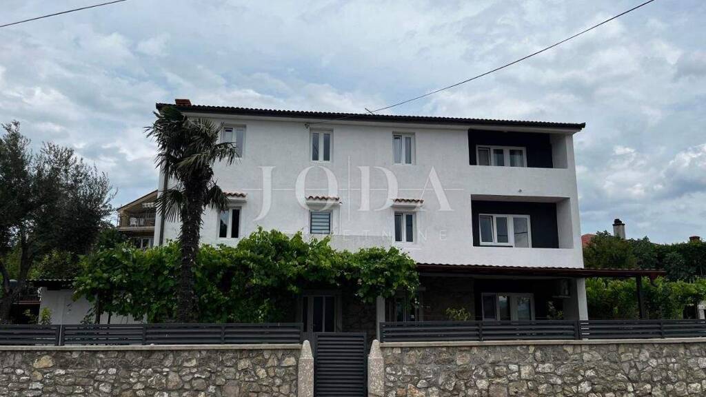 Haus zu verkaufen in der Nähe von Malinska auf der Insel Krk. Das Grundstück verfügt über ca. 360 m2 und ca. 260 m2 Garten. Das Haus besteht aus fünf Wohnungen, davon eine ein Studio-Apartment, eine Wohnung mit einem Schlafzimmer, zwei Wohnungen mit zwei Schlafzimmern und eine mit drei Schlafzimmern. Die Wohnungen verfügen über schöne Terrassen und Balkone, einige haben einen schönen Meerblick.