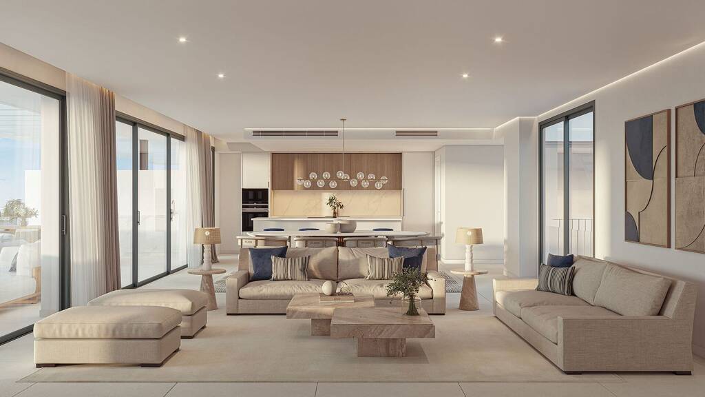 Die Mehrfamilienhäuser bieten attraktive Grundrisse mit 2, 3 oder 4 Schlafzimmern ab 136 m², ergänzt durch expansive Terrassen von bis zu 60 m². Die offenen Küchen, die nahtlos in das Wohnzimmer übergehen, bieten eine moderne Ausstattung. Zudem steht eine gemeinschaftliche Tiefgarage für jede Einheit zur Verfügung.