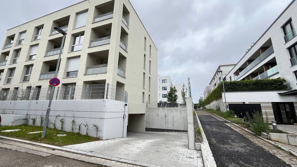Die Einfahrt der Tiefgarage befindet sich im Limburgweg, was gegenüber vom Jusiweg in Denkendorf ist, perfekt für die begrenzte außen Parkmöglichkeiten im Wohngebiet.