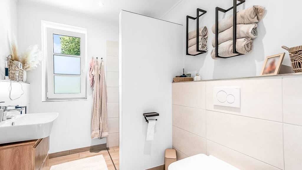 Das Erdgeschoss umfasst eine großzügige offene Wohnküche mit direktem Zugang zur Terrasse, ein Duschbad, ein Zimmer, ein Hauswirtschaftsraum und einen Flurbereich. Im Dachgeschoss befinden sich ein zweites Duschbad, ein Schlafzimmer und zwei weitere Zimmer. Über eine Bodentreppe gelangen Sie auf den Spitzboden.