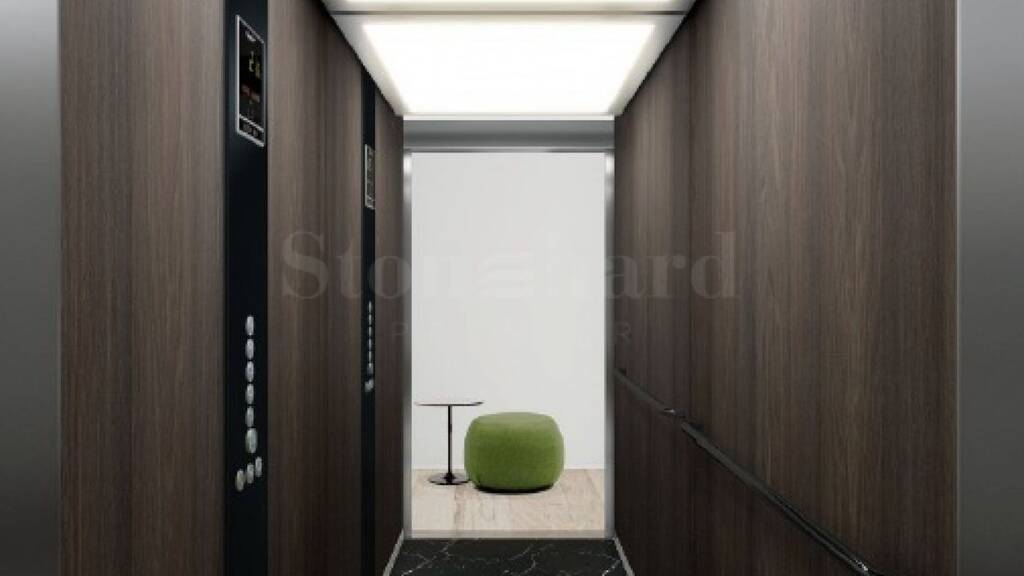 Leise Hightech-Aufzüge mit LED-Beleuchtung und automatischer Abschaltung im Ruhezustand. Innenraum mit schwarzem Marmorboden, elegantem schwarzen Bedienfeld und Wänden aus gerösteter Kaffeeeiche.