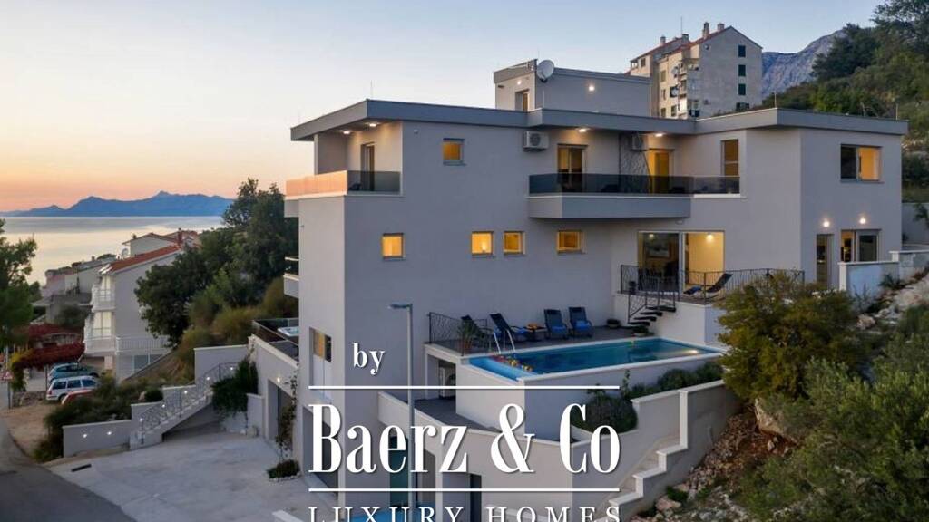 pbeautiful newly built villa with swimming pool, near makarska. modern design, living area of 760m2 spread over four floors with 4 residential units, 2 identical two-story apartments, one-room apartment and studio apartment. suitable for living or tourist purposes, extremely elegantly and luxuriously equipped./ppapart from the fact that the villa has a swimming pool, jacuzzi, custom-made outdoor grill, private parking and garage, it also has a sea view from all rooms, including those oriented to the north./ppextremely quiet location, close to all necessary facilities. 400m from the sea, on a cascading terrain./ppfor all other information on request./p