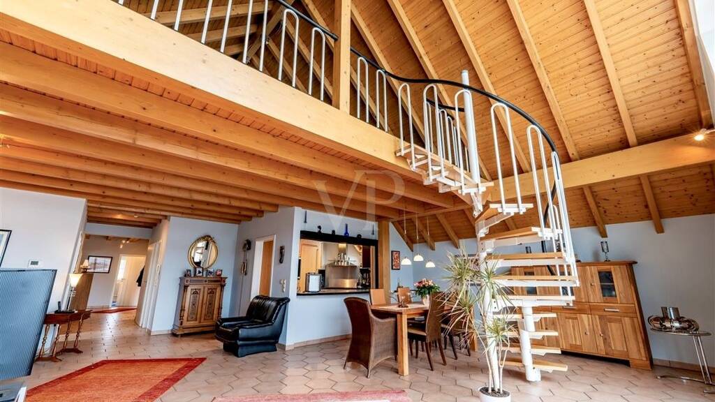 Im obersten Geschoss befindet sich eine weitere exklusive und hochwertig ausgestattete Penthouse Wohnung. Auf zwei Etagen verteilen sich ca. 200 m² auf 5 Zimmer, Galerie, Küche, 2 Bäder und ein Abstellraum. Der großzügige Balkon bietet nicht nur eine optimale Südausrichtung sondern auch einen traumhaften Fernblick bis zum Schloss Montabaur. Raumhohe Fensterfronten mit Beschattungsanlage, eine großzügige Deckenhöhe mit offener Holzbalkendecke aus naturbelassenem Kiefernholz, Fußbodenheizung und eine Galerie sind nur einige der Extras, die diese anspruchsvolle Wohnung abrunden.