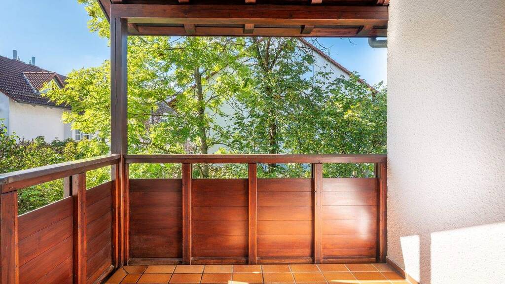 Das lichtdurchflutete Wohnzimmer bietet ausreichend Platz für einen gemütlichen Wohn- und Essbereich. Von hier aus betreten Sie den überdachten Balkon, der mit seinem Blick ins Grüne zum Verweilen und Entspannen einlädt. Ob ein Frühstück an der frischen Luft oder ein ruhiger Feierabend - dieser Platz bietet eine angenehme Erweiterung des Wohnraums.