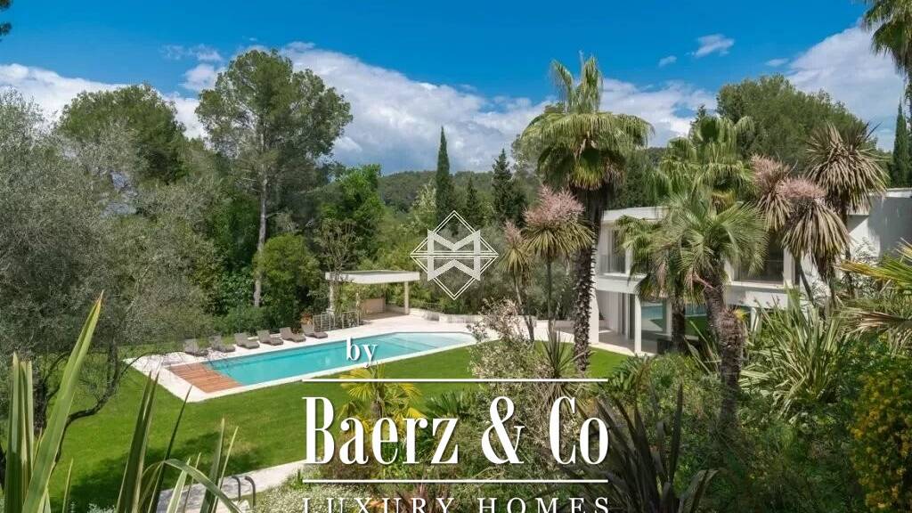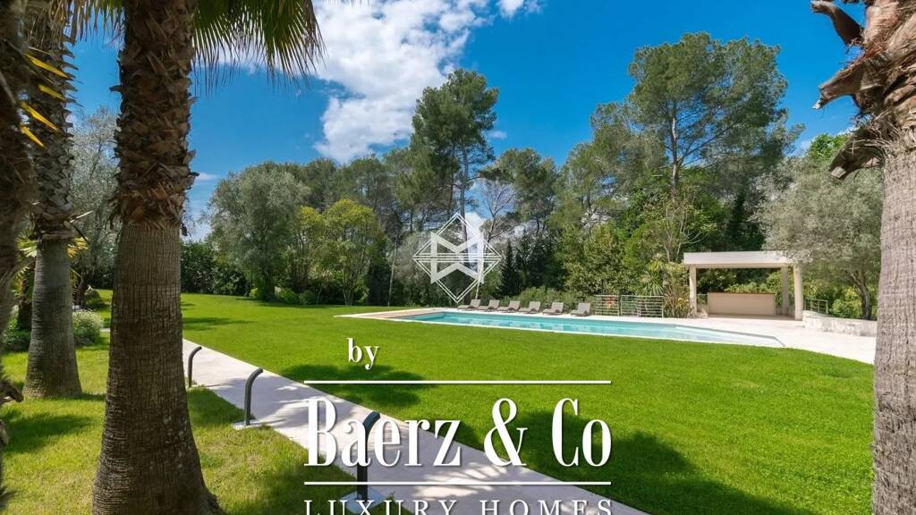 in a quiet environment, in a residential and much sought-after area of mougins. contemporary villa, recently renovated, of a surface of 625m², set on a flat land of 8500m² with a heated swimming pool and a pool-house accommodating a summer kitchen. the very sunny villa, south west exposed and unoverlooked, comprises: large reception room with a fireplace, wine cellar, dining room, separate fitted kitchen with staff entrance, laundry room, 7 bedrooms and 3 staff bedrooms. 1 garage. carport for 3 cars.