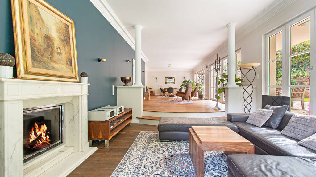 - Umfangreiche Ausstattung: 2,90 m hohe Decken, Fußbodenheizung, Kamin, Bose-Soundsystem, Occhio Leuchten, Kameraüberwachung, LAN Verkabelung mit 40 Netzwerkdosen, Wäscheschacht, Staubsauger- und Photovoltaikanlage