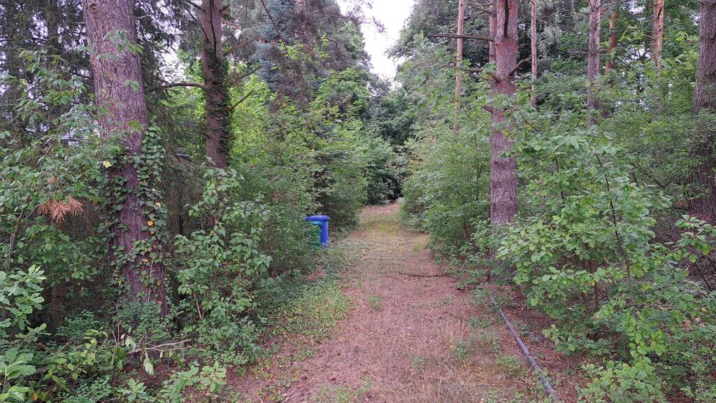 Großes, rechteckiges, eingezäuntes Waldgrundstück in Wald- und Wassernähe. Etwa 20 m Straßenfront mit linksseitiger Autozufahrt. Mit diversen Nadelbäumen bewachsen, die gefällt werden können. Weiterhin befinden sich Reste eines Holzbungalows, ein alter PkW sowie ein alter Camping-Anhänger noch auf dem Grundstück.