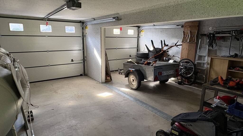 Für Fahrzeuge stehen zwei Garagen und zwei weitere Stellplätze zur Verfügung. Das Dachgeschoss ist nicht ausgebaut, bietet aber zusätzlichen Stauraum. Das Dach ist mit Betondachpfannen versehen und besonders langlebig.