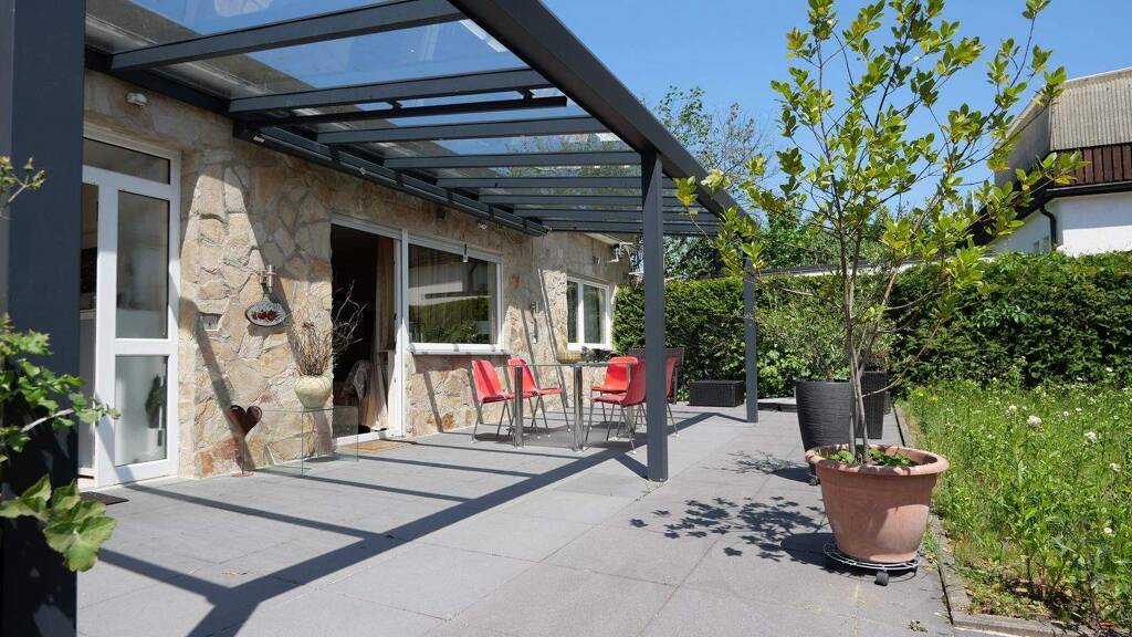 •Große Terrasse mit glasüberdachter Pergola und Beschattungsmöglichkeiten