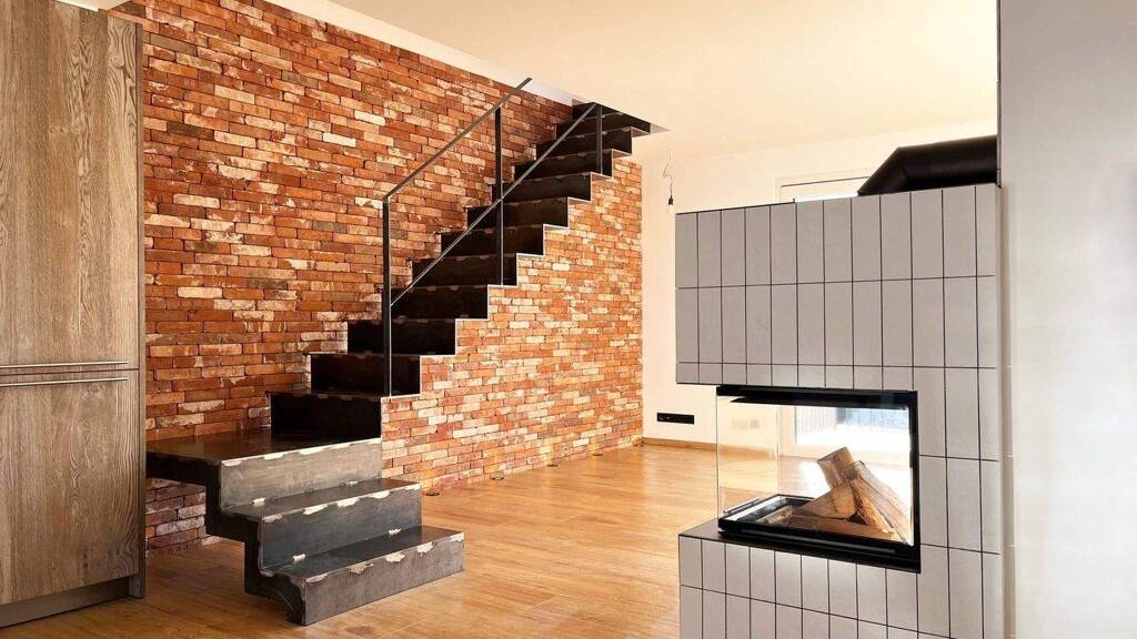 Auf zwei Ebenen empfängt Sie ein offener Wohn-/Essbereich mit einer hochwertig gestalteten Küche im unteren Stockwerk. Ein besonderes Highlight ist der Kaminofen zwischen dem Wohn- und Essbereich, der die gesamte Wohnung in wohltuende Wärme hüllt - besonders behaglich an kühleren Herbst- und Wintertagen. Ergänzt wird diese Etage durch ein helles Gäste-WC und einen Balkon.