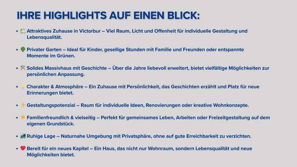 Victorbur vereint somit naturnahes Wohnen, eine zentrale Lage, attraktive Freizeitmöglichkeiten und eine zukunftssichere Infrastruktur - ideal für alle, die Lebensqualität, Ruhe und kurze Wege miteinander verbinden möchten.