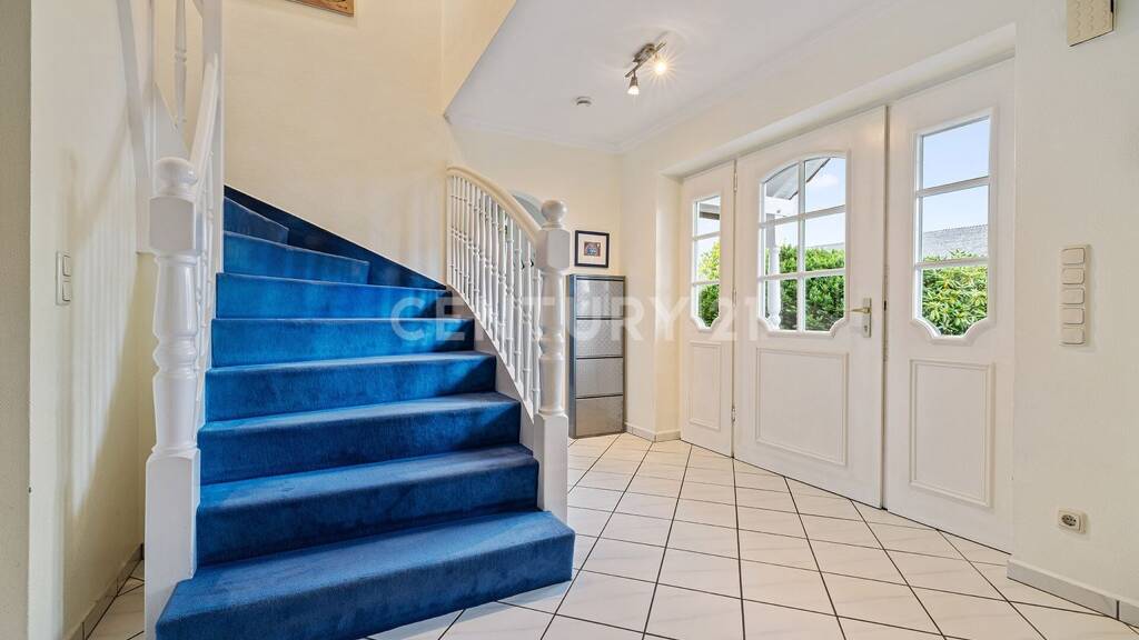 Der einladende Eingangsbereich mit stilvoller zusätzlicher Giebelüberdachung zieht alle Blicke auf sich und schafft ein beeindruckendes Entree zum einladenden und großzügigen Dielenbereich mit der ästhetischen Treppe ins Obergeschoss.