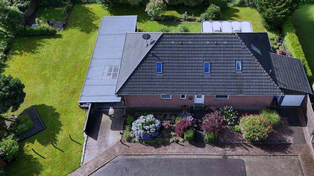Von dort gelangen Sie auf die ebenfalls südlich ausgerichtete, angelegte Terrasse und den großen, pflegeleicht angelegten Garten mit großer Rasenfläche.