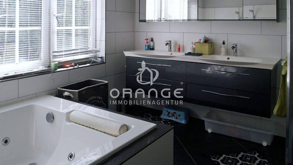 Beide Wohnungen haben einen eigenen Eingang. 2015 wurde das Haus komplett entkernt und das Erdgeschoss modernisiert. Das offene Raumkonzept verbindet Küche, Essbereich und Wohnzimmer. Gartenseitig schließt sich die ca. 30 m² große, überdachte Terrasse mit Süd-Ausrichtung an. Die Wohnung im Obergeschoss hat auch vier Zimmer, eine Küche und ein kleines Wannenbad. Aktuell ist sie noch im Zustand eines Rohbaus. Im Dachgeschoss befinden sich zwei Büros und eine Pantryküche.