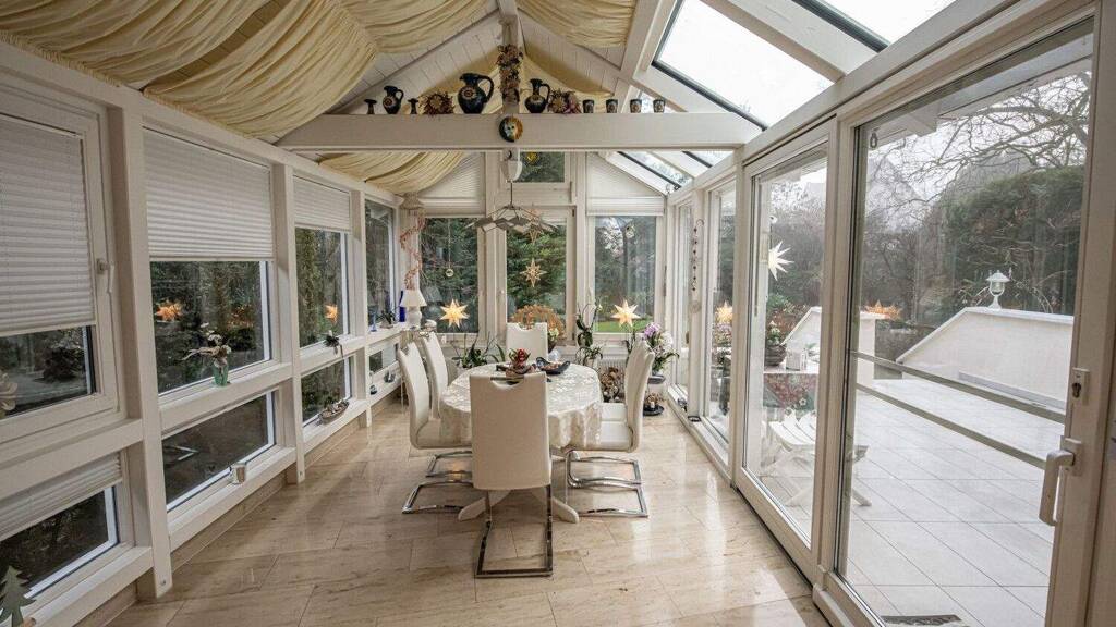 Bereits beim Betreten des Hauses wird die Großzügigkeit des Grundrisses spürbar. Der offen gestaltete Wohn- und Essbereich im Erdgeschoss überzeugt durch helle Natursteinböden, großzügige Fensterflächen und fließende Übergänge zwischen den einzelnen Wohnzonen. Ein hochwertiger Holz-/Kachelofen sorgt für eine behagliche Atmosphäre und unterstützt die Beheizung mehrerer Geschosse - insbesondere in der Übergangszeit ein geschätzter Komfortfaktor. Der angrenzende Wintergarten erweitert den Wohnraum auf elegante Weise: lichtdurchflutet, beheizbar und nahezu ganzjährig nutzbar, mit Blick in den gepflegten Garten sowie direktem Zugang zur großzügigen Terrasse.