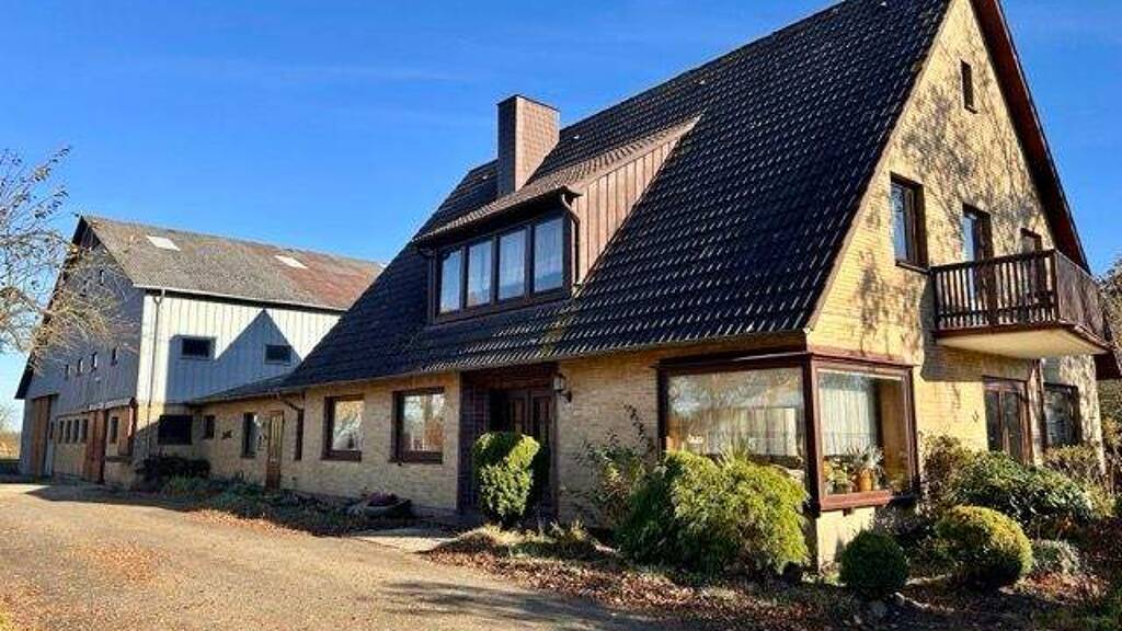 Die isolierverglasten Holzfenster und das mit Pfannen gedeckte Dach unterstreichen die solide Bauweise. Die Fassade des Wohnhauses ist mit gelbem Klinker ausgeführt. Vom Wohnhaus gelangt man direkt in das Nebengebäude, das über zwei weitere Ausgänge (zur Garten- und Eingangsseite) verfügt. Über den Ausgang zur Gartenseite erreicht man die 2. Terrasse. Im Nebengebäude befinden sich zudem ein kleiner Abstellraum, ein weiteres Zimmer sowie ein Duschbad und ein direkter Zugang zur Garage. Von dort führt der Weg in den gepflegten Stallbereich mit Milchkammer und weiteren funktionalen Räumlichkeiten.