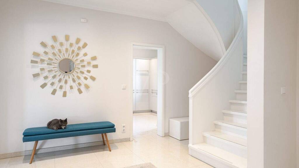 Beim Betreten des Hauses präsentiert sich ein großzügiger Eingangsbereich, der mit seinen weiten Flächen und einer geschickt integrierten Garderobe einen eindrucksvollen ersten Moment schafft.