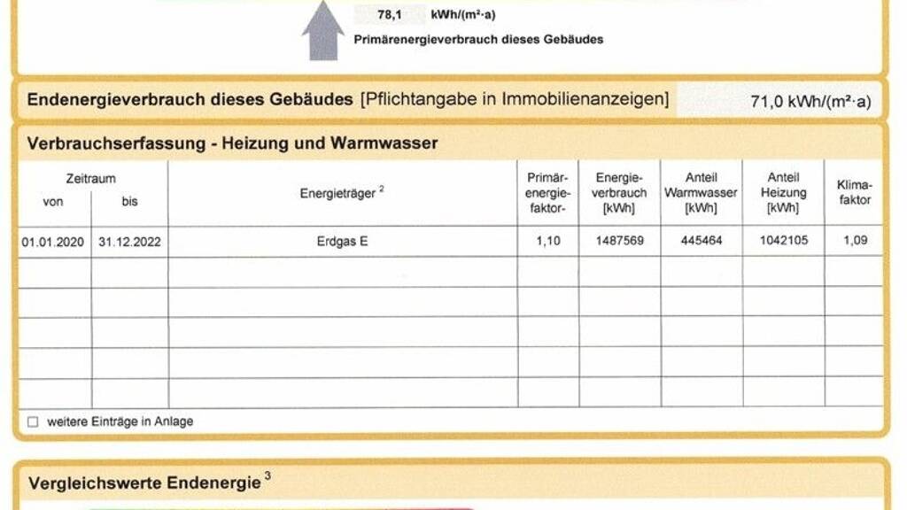 Energieausweis nach Verbrauch, Endenergieverbrauch 71,0 kWh (m²-a), EK B, Energieträger Erdgas, Bj. Wärmeerzeuger 2005