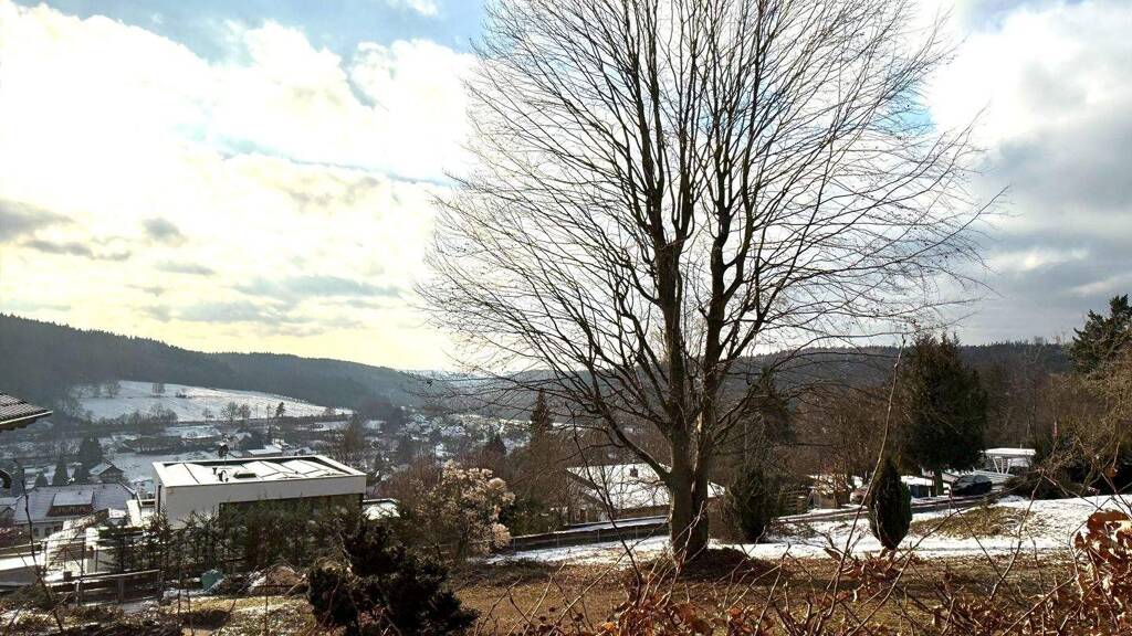Durch die exponierte Wohnlage in oberster Baureihe von Breitenborn genießen Sie einen herrlichen Fernblick. Diese Fernsicht ist unverbaubar. Die Hanglage würden wir als leicht bis mittel einstufen.