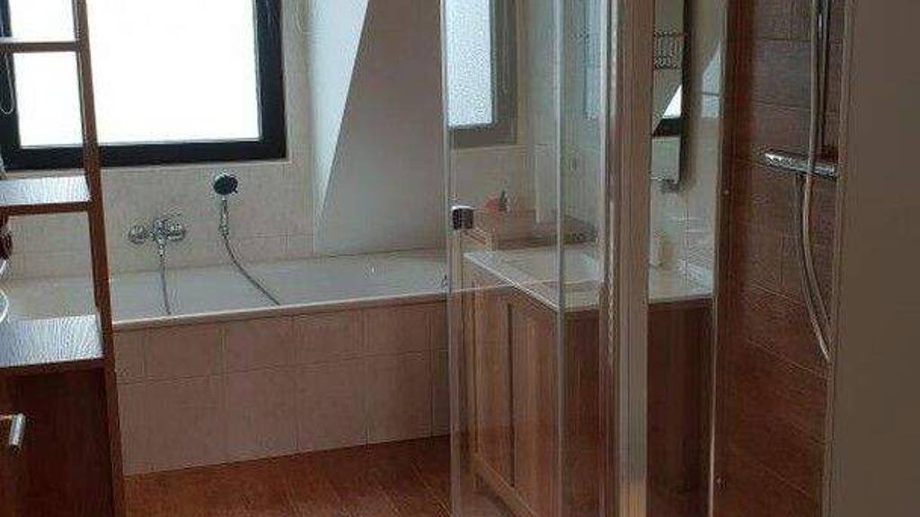 Das Badezimmer verfügt über neue Möbel, einen neuen Waschtisch, eine moderne, neue Dusche und eine Badewanne.