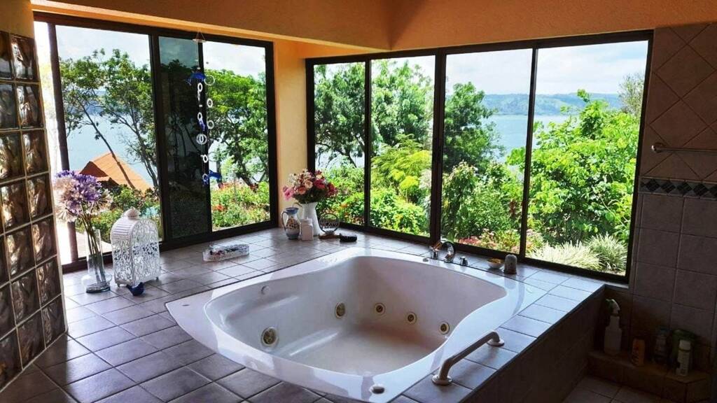 This is an offering of paradise for just the right person. Are you one who can appreciate hummingbirds and butterflies as you soak in a whirlpool tub? Are you the one who can enjoy the view of a volcano to the east of a stunning deck? Or to the west the magnificent sunset? And straight ahead a view of the lake? Do you like toucans and parrots? No kidding. Who would not?