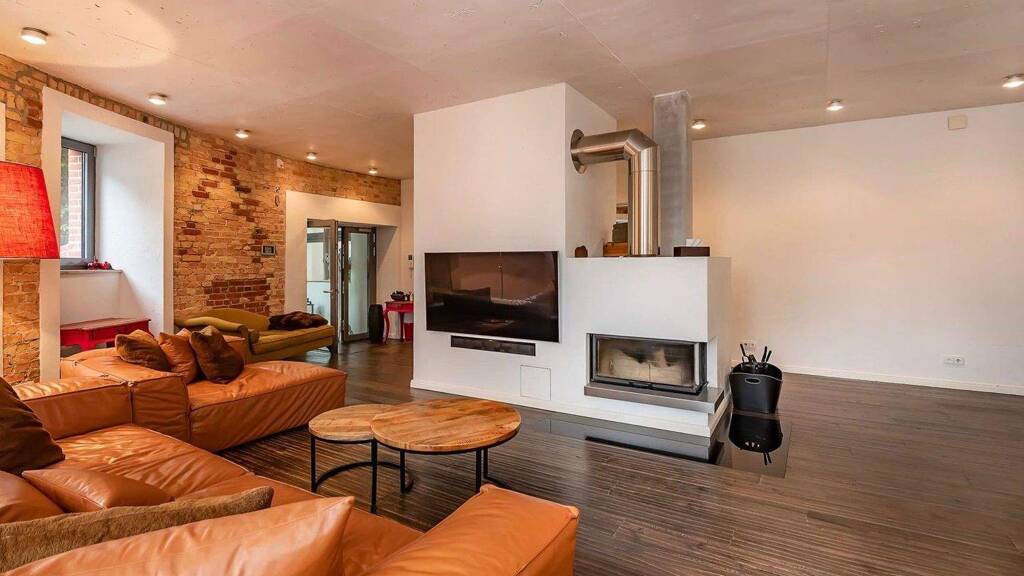 Herzstück ist der großzügige, offen gestaltete Wohn- und Essbereich, der durch seine Weite und die besondere Gebäudeform ein einzigartiges Loft-Gefühl schafft. Hier entsteht ein stimmiger Rahmen für den Alltag ebenso wie für Empfänge oder gesellige Abende. Die moderne Einbauküche ist harmonisch integriert und bietet ideale Voraussetzungen für Kochen, Bewirten und gemeinsames Zusammensein.