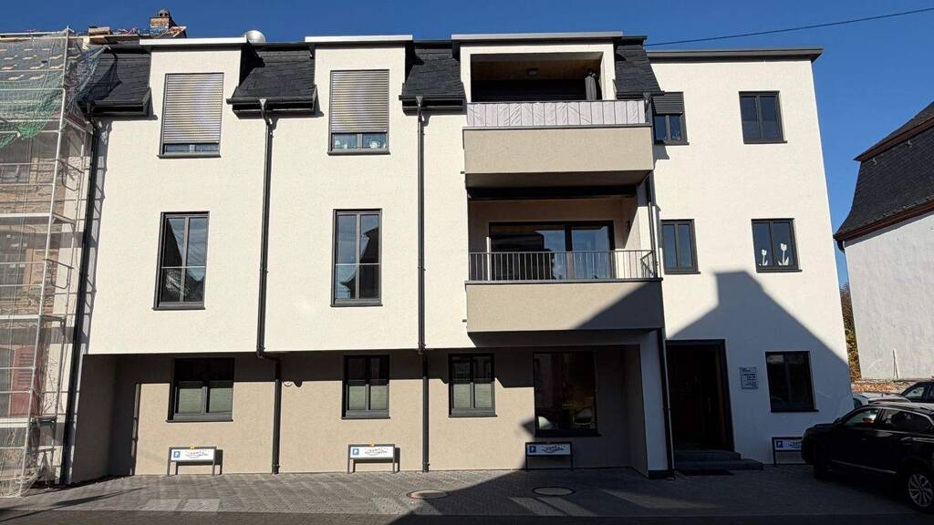 Im ersten Obergeschoss eines modernen Neubaus erwartet Sie eine lichtdurchflutete und hochwertig ausgestattete Eigentumswohnung mit einer Wohnfläche von rund 111 m². Das Gebäude wurde im Jahr 2024 errichtet, die Fertigstellung der Wohnung erfolgte 2025. Insgesamt umfasst das Haus drei Parteien: die angebotene Wohnung im ersten Obergeschoss, eine weitere Einheit im zweiten Obergeschoss sowie eine Physiotherapeuten-Praxis im Erdgeschoss. Die moderne Architektur, die klare Grundrissgestaltung und die zeitgemäße Ausstattung verleihen der Wohnung ein attraktives und einladendes Wohnambiente. Die Konstruktion besteht aus Brettsperrholz im Erdgeschoss und zeitgemäßer Holzrahmenbauweise in den oberen Etagen. Holz-Alufenster mit Schallschutzverglasung zur Straßenseite, eine Dacheindeckung aus Naturschiefer sowie ökologische Materialien wie Zellulosedämmung und Holzfaserplatten unter dem Außenputz zeugen von einer durchdachten und hochwertigen Bauweise. Die Wohnung verfügt über 4 Zimmer, darunter ein großzügiger, offener Wohn- und Küchenbereich, der den Raum mit natürlichem Licht durchströmt. Ergänzt wird das Raumangebot durch ein modernes Badezimmer, ein separates Gäste-WC sowie einen praktischen Hauswirtschafts- bzw. Abstellraum. Zwei Balkone – eine sonnige Loggia zur Frontseite und ein weiterer Balkon zur Rückseite – erweitern den Wohnraum und schaffen Orte für entspannte Momente im Freien. Energetisch erfüllt das Haus höchste Standards: Eine effiziente Wärmepumpe, Fußbodenheizung in allen Räumen und eine konsequent ökologische Ausrichtung sorgen für einen exzellenten Energiehaushalt. Hochwertiger Vinylboden und Fliesen verleihen den Innenräumen eine warme und langlebige Basis, während die maßgefertigte Küche von Leitzgen im Wert von 9.000 Euro bereits im Kaufpreis enthalten ist. Zur Wohnung gehört zusätzlich ein 10 m² großer Nutzraum im Nebengebäude, ideal nutzbar als privater Kellerraum. Zwei großzügige Pkw-Stellplätze (je ca. 3,25 m × 11,00 m) bieten komfortable Parkmöglichkeiten. Diese sind auch schon im Preis enthalten. Das gesamte Grundstück umfasst etwa 400 m². Eine Wohnung, die moderne Architektur, nachhaltige Technik und eine ruhige, helle Wohnatmosphäre harmonisch miteinander verbindet.