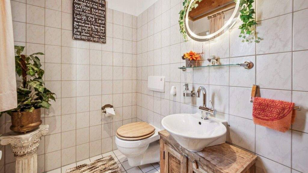 Eine offene Holztreppe führt ins Obergeschoss, wo sie 3 gemütliche Schlafzimmer (alle mit Balkon), ein im Jahr 2023 neu gestaltetes Tageslicht-Bad mit Whirlpool, Eckbadewanne, bodentiefer Dusche, Handtuchheizkörper usw. und einen extra Saunaraum mit einem bodentiefen Außenfenster erwartet.