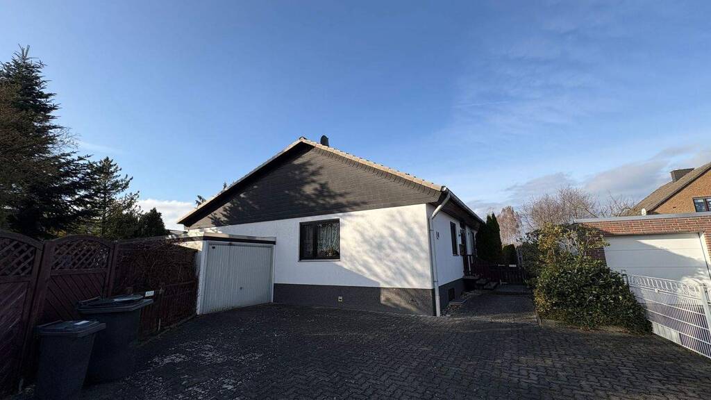 Dieser gepflegte Bungalow bietet eine Wohnfläche von 120,25 m² und liegt auf einem großzügigen Grundstück von 885 m². Die Immobilie verfügt über vier Zimmer, darunter ein großes Wohn/-Esszimmer mit Terrassenzugang, drei Schlafzimmer, ein Tageslichtbad mit Badewanne und Dusche, sowie eine Einbauküche. Eine Terrasse und ein eigener Garten schaffen zusätzlichen Raum zur Erholung. Der Keller bietet praktische Lagermöglichkeiten. Die Böden sind mit Fliesen ausgestattet. Ein Stellplatz in der Garage und ca. 3 Außenstellplätze sind auch vorhanden. Die Energiebereitstellung erfolgt über Erdgas.