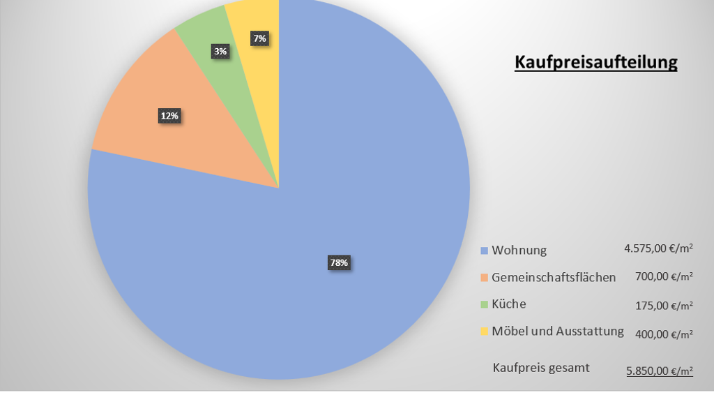 Der Anteil für dieses zusätzlichen Gemeinschaftsflächen beträgt zusätzlich 700,00 €/m² und die dazugehörige Ausstattung und Möblierung 400,00 €/m² sowie eine Küche im Wert von ca. 18.000,00 €.