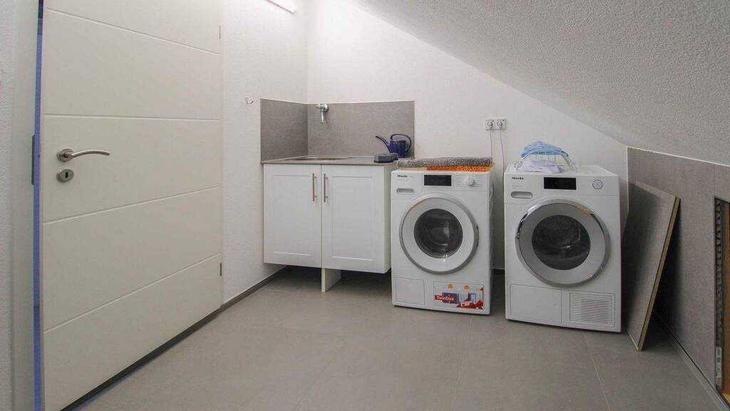 Über eine Wendeltreppe gelangt man ins Obergeschoss, wo sich der Hauswirtschaftsraum mit Waschmaschine, Trockner und Waschbecken befindet. Die Dachbodendämmung von 25 cm sorgt für optimale Energieeffizienz.