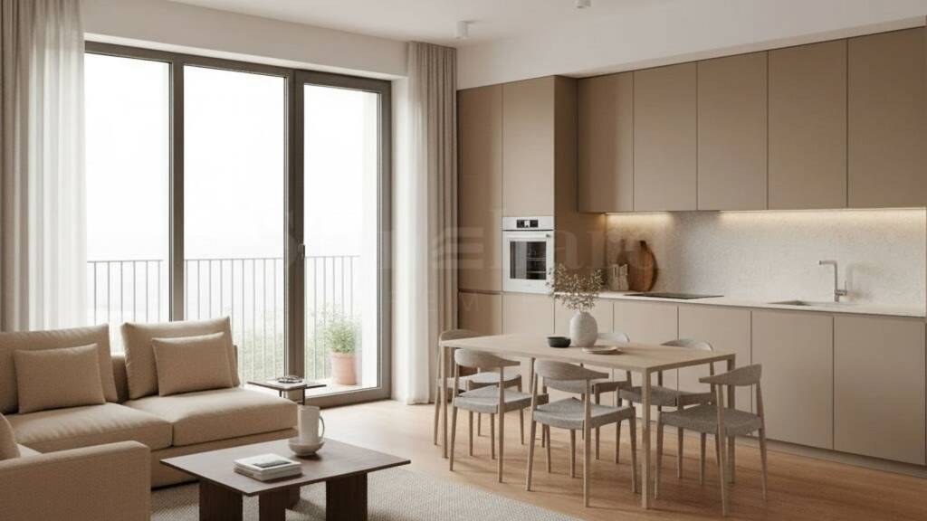 - Aufteilung: Wohnzimmer mit Kochnische, komfortables Schlafzimmer, Badezimmer und Terrasse im Loggia-Stil;