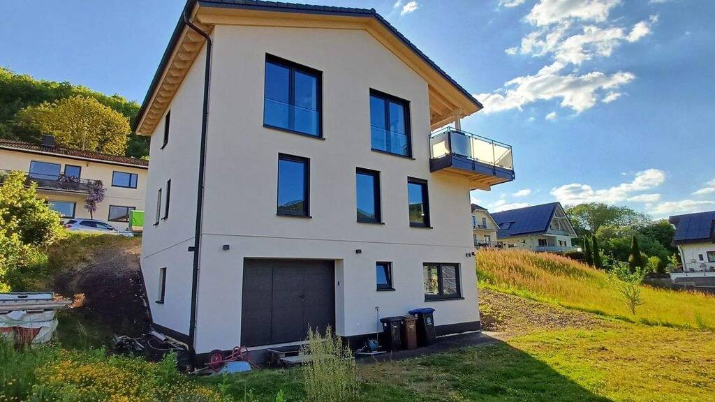 Das großzügige und freistehende Einfamilienhaus wurde erst ca. 2023 vollunterkellert errichtet und lässt im Hinblick auf aktuelle Energie- und Wohnstandards keine Wünsche offen. Auf insgesamt 3 Etagen stehen hier helle und einladende Wohn- und Schlafräume für einen Haushalt mit 4-5 Personen zur Verfügung. Durch die Hanglage des Grundstücks bietet das Anwesen eine attraktive Aufteilung für junge und aufgeschlossene Eigentümer. Über eine Außentreppe gelangt man in den offen gestalteten Eingangsbereich des Hauses. Dieser führt zum großzügigen und lichtdurchfluteten Wohn-/Essbereich mit einer ca. 4 m hohen, offenen Holzbalkendecke und der offen angrenzenden Küche sowie dem umlaufenden Balkon. Außerdem stehen auf dieser Etage noch ein Gäste- oder Schlafzimmer sowie ein Duschbad zur Verfügung. Eine Etage tiefer befinden sich das Elternschlafzimmer, 2 Kinderzimmer sowie das große Hauptbad. Ein großzügiger Souterrain-Keller mit Gartenausgang bietet neben der großen integrierten Doppel-Garage außerdem ein zusätzliches Arbeits- oder Gästezimmer und ein WC sowie weitere Nutzräume. Das insgesamt ca. 635m² große Grundstück kann vom neuen Eigentümer nach eigenen Wünschen fertig angelegt und gestaltet werden.
