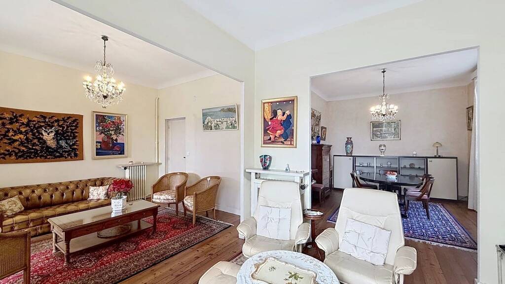 Das Haus behält den Charme und die Authentizität der 1930er Jahre, mit großzügigen Räumen, 3 Meter Deckenhöhe, Massivholzböden und einem Kamin mit Insert.