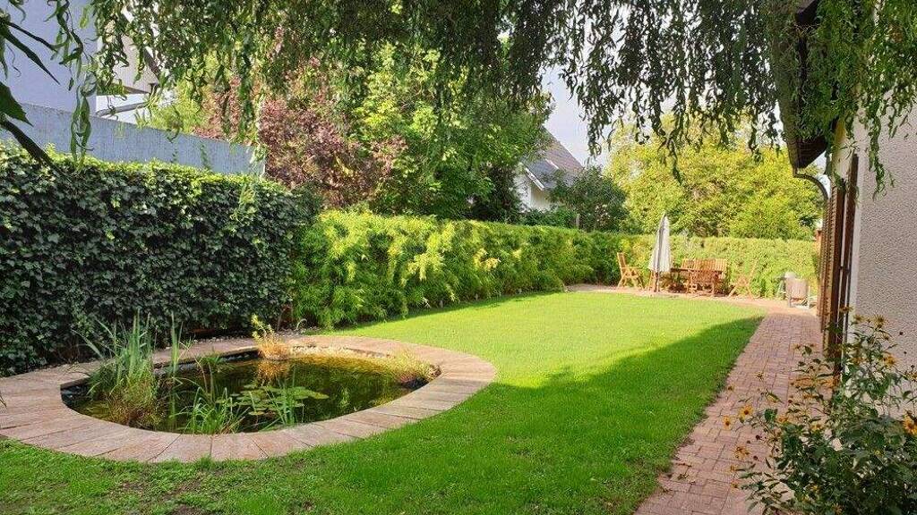Der Garten ist ein behutsam komponierter Rückzugsraum: Alter Baumbestand verleiht ihm Tiefe und Charakter. Südlich und westlich grenzt das Grundstück an eine hohe Bambushecke, die zu den Nachbargrundstücken hin natürlichen Sichtschutz bietet. Zur Straße hin sorgen gepflegte, teils alte, teils neu gepflanzte Koniferen mit Eiben für eine grüne und harmonische Abgrenzung. Ein kleiner Teich mit Pumpe setzt einen stillen Akzent, während Bewässerungsanlage und pflegeleichte Gestaltung den Alltag erleichtern. Ein Gartenhaus im hinteren Grundstücksbereich (ca. 3 × 4 m), ein separater Kaminholzplatz sowie Unterstellmöglichkeiten für Fahrräder fügen sich funktional und unaufdringlich in das Gesamtbild ein. Zwei Carports bieten Platz für Fahrzeuge.