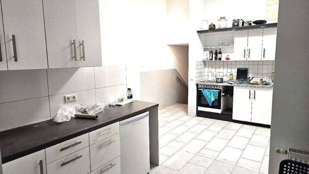 Modernes Duschbad - Gemeinschaftsküche mit allem Drum und Dran (Das heißt, Sie nutzen die Küche gemeinsam mit drei weiteren Bewohnern der Etage!) - Vinylboden - Waschküche mit Waschmaschinen, die zur Verfügung stehen.