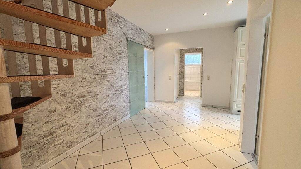 Eine sehr große und helle Eingangsdiele bietet viel Platz für eine Garderobe und verschiedene Kleinmöbel. Hinter der Wohnungseingangstür führt auf der linken Seite eine Wendeltreppe in das ausgebaute Dachgeschoss. Auf der rechten Seite finden Sie das erste (Schlaf-) Zimmer, der Schnitt und die reelle Größe erlauben verschiedene Einrichtungs- und Nutzungsmöglichkeiten, sei es als Schlafzimmer, Kinderzimmer, Büro oder Gästezimmer. Die folgende, zum Flur hin offen gestaltete, Küche ist beidseitig mit hellen Einbauzeilen ausgestattet, neben Herd mit Ceranfeld und Dunstabzugshaube, Kühl- Gefrierschrank und Spüle finden Sie viele Unter- und Oberschränke und Platz und Anschlussmöglichkeiten für Ihren Geschirrspüler und Ihre Waschmaschine. In der Flurdiele vor der Küche kann ein gemütlicher Essplatz eingerichtet werden. Das große Dachflächenfenster sorgt für ausreichend Tageslicht und die direkte Belüftung. Wie auch in der Eingangsdiele sind in der Küche Spots in die Decke eingelassen, die für eine großflächige und angenehme Beleuchtung sorgen. Ein optisch etwas abgetrennter Flurbereich eröffnet den Weg zum zweiten (Schlaf-) Zimmer und zum Badezimmer. In einer hier installierten, kleinen Abstellkammer verfügen Sie über Platz und Stauraum für Ihre Haushaltsgeräte und Vorräte. Das Badezimmer ist neben dem WC und Handwaschbecken mit einer Badewanne mit Duschtrennwand ausgestattet. Die Sanitärmöbel sind in Weiß gehalten, die Wand- und Bodenfliesen sind hellmeliert. Ein großes, mit Ornamentglas versehenes Fenster sorgt für ausreichend Tageslicht und die direkte Belüftung. Das anschließende Schlafzimmer hat eine schöne Größe und ist durch das große Fensterelement sehr schön hell. Hier finden Sie auch für größere Schlafzimmermöbel ausreichend Platz und Stellflächen. Der Fußboden ist mit Laminatboden in Buchoptik versehen. Das Wohnzimmer überzeugt ebenfalls durch eine schöne Größe und einen guten Schnitt, eine größere Sofa-Ecke und verschiedene Schrankelemente finden ausreichen Platz. Das in der Gaube errichtete große Fensterelement ist nach Westen ausgerichtet und lässt viel Tageslicht in den Raum. Auch hier sind Spots in die Decke eingelassen, die für eine optimale Beleuchtung sorgen. Im ausgebauten Dachgeschoss verfügen Sie über eine durch das große Fenster sehr schön helle Galerie als Vorraum, die optimal als kleine Bürofläche genutzt werden kann, ergänzend finden kleine Kommoden oder Regale hier ihren Platz. Der durch eine Tür abgetrennte folgende Raum hat eine optimale Größe und ist durch die großen Fenster lichtdurchflutet und ganz vielfältig nutzbar. In die Dachschrägen auf der rechten Seite sind kleine Abstellnischen installiert und bieten Stauraum für Diverses. Der Fußboden im Dachgeschoss ist komplett mit hellem Laminatboden versehen.