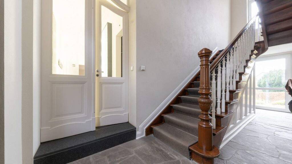 Über eine hochwertige Doppelkassettentür mit Glaseinsätzen gelangt man in den geräumigen Flur, von dem sich alle Bereiche auf angenehme und logische Weise erschließen. Eine eingebaute Garderobe, direkt links vor dem Tageslicht-Badezimmer, sorgt für Ordnung und einen gepflegten Empfangsbereich. Das Bad selbst überzeugt mit einem großen Waschtisch samt Unterschrank sowie wandhoch gefliesten Flächen in elegantem Muster aus weißen Fliesen und Granitstein, die dem Raum eine zeitlose und hochwertige Eleganz verleihen.