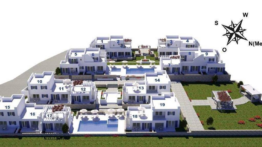 Es gibt zwei Arten von Immobilien: ein- und zweistöckige Häuser. Jedes Objekt verfügt über Meerblick, einen eigenen Garten und eine Dachterrasse, während einige Objekte mit schattenspendenden Pergolen ausgestattet sind.