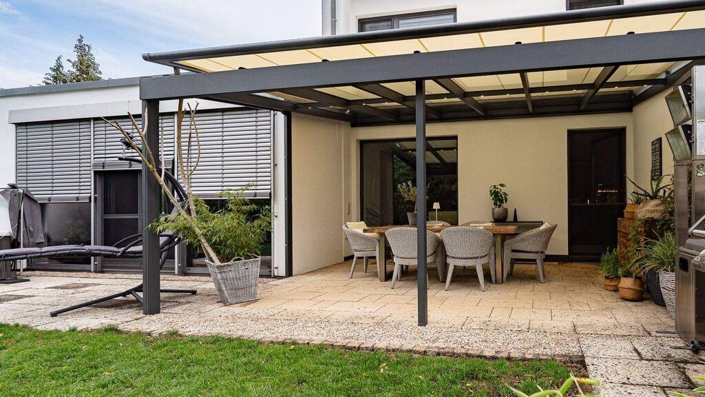 Dieses außergewöhnliche Einfamilienhaus vereint Großzügigkeit, moderne Architektur und vielfältige Nutzungsmöglichkeiten. Der lichtdurchflutete Anbau von 2002 beeindruckt mit einer eleganten Alufensterfront, Sichtbetondecke und einem gemütlichen Kaminofen. Der großzügige Wohn- und Essbereich (ca. 30 qm) bietet herrliche Gartenblicke, während die angrenzende Terrasse mit Alu-Glasüberdachung nahtlos den Außenbereich integriert.