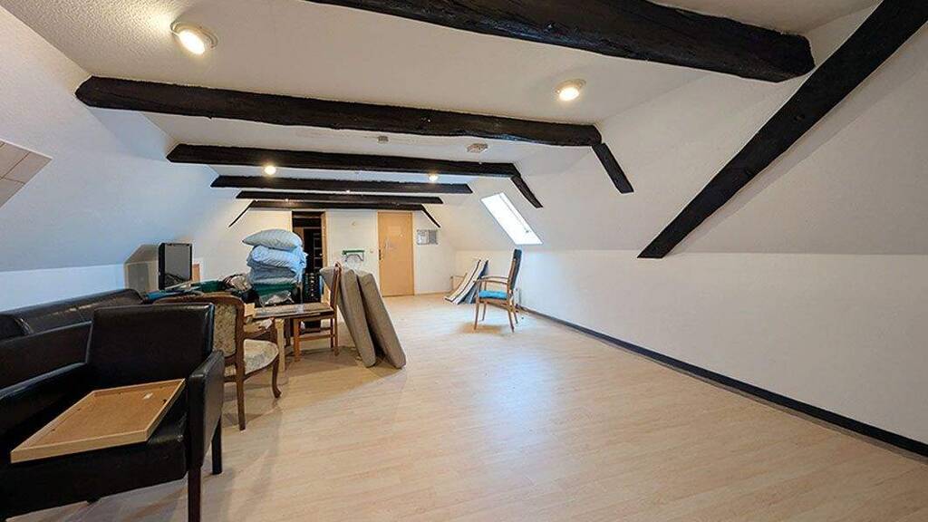 Spitzboden: ca. 33,19 m² großer Aufenthaltsraum, Lager, Umkleide Damen, Umkleide Herren, Archiv, Bad und Abstellkammer (Nutzung aus Brandschutzgründen nicht genehmigungsfähig).