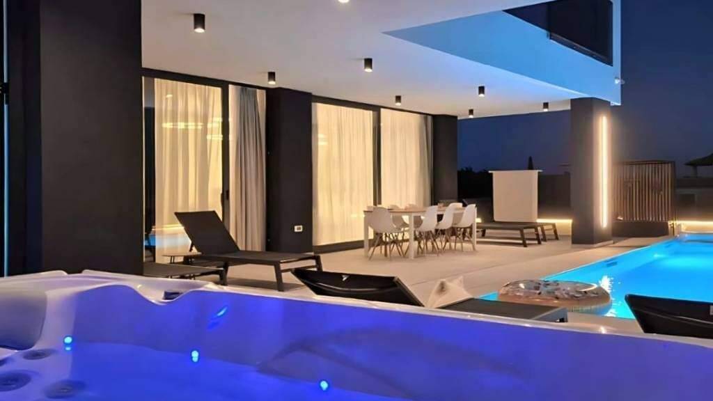 Das Haus ist ideal für einen Familienurlaub, denn neben einem großzügigen Garten mit Pool im Erdgeschoss bietet es einen Whirlpool und eine Sauna.