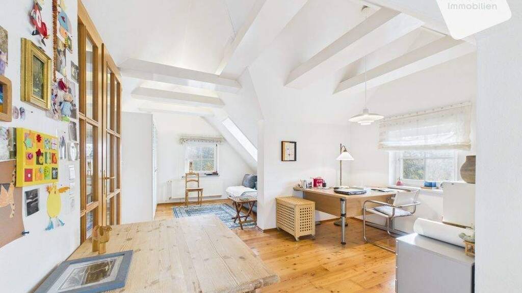 Eine offene Holztreppe verbindet beide Etagen und verstärkt das großzügige Raumgefühl. Im Obergeschoss bieten ein offener Wohn-/Schlafbereich, ein separates Arbeitszimmer und ein weiteres Schlafzimmer vielseitige Nutzungsmöglichkeiten. Die stilvoll erneuerten Bäder auf beiden Etagen sowie die neue Küche betonen den hochwertigen, bezugsfertigen Zustand des Hauses.