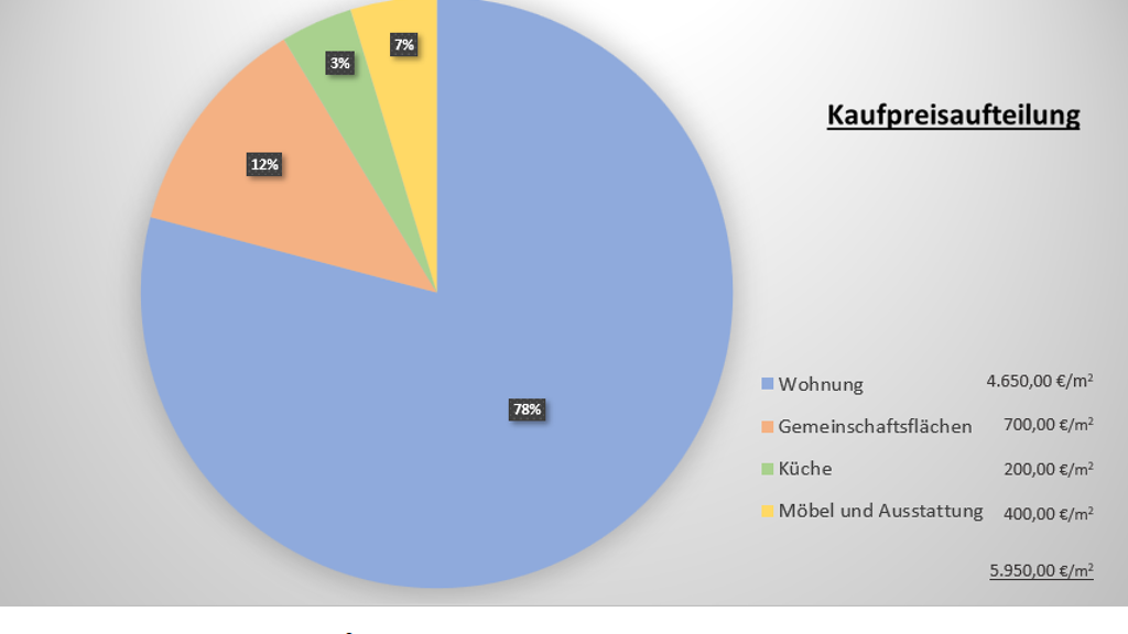 Der Anteil für dieses zusätzlichen Gemeinschaftsflächen beträgt zusätzlich 700,00 €/m² und die dazugehörige Ausstattung und Möblierung 400,00 €/m² sowie eine Küche im Wert von ca. 18.000,00 €.