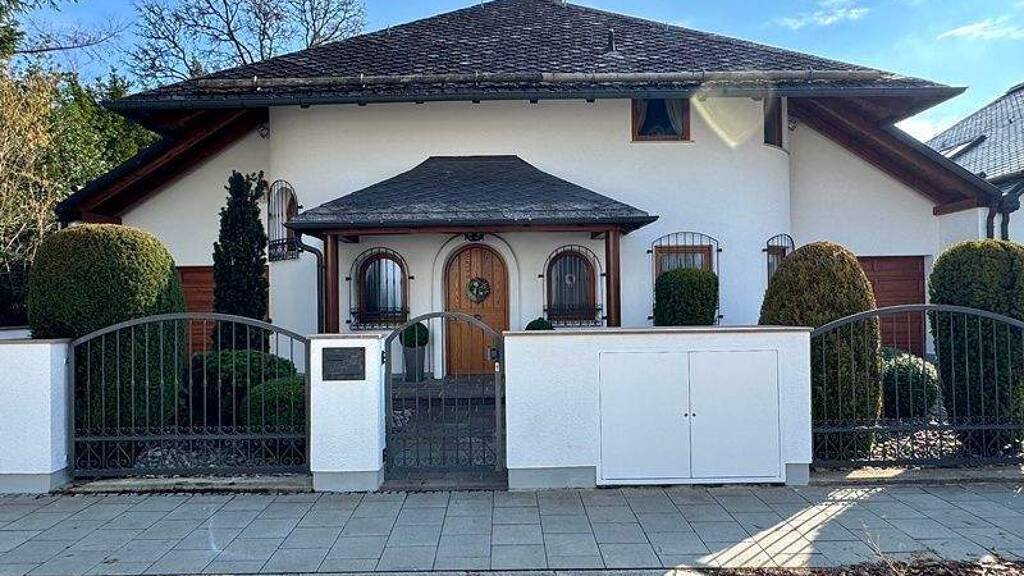 In einer der begehrtesten Lagen von Hohenbrunn-Riemerling befindet sich dieses exklusive Einfamilienhaus. Das Haus wurde 1999 in massiver Ziegelbauweise errichtet. Es verbindet zeitlose Landhaus-Eleganz mit klassischer Architektur. Das real geteilte Grundstück umfasst ca. 558 m². Die Immobilie bietet großzügige Räume, eine angenehme Wohnatmosphäre und hohen Wohnkomfort. Schon beim Betreten des Hauses entsteht ein besonderer erster Eindruck. Die großzügige Eingangsdiele mit offener Galerie, geschwungener Treppe und kunstvoll gearbeitetem Geländer wirkt repräsentativ, aber zugleich warm und einladend. Das Herzstück des Hauses ist der großzügige Wohn- und Essbereich. Helle Holzkassettendecken, maßgefertigte Einbauschränke und ein offener Kamin verleihen dem Raum eine stilvolle und behagliche Atmosphäre. Zwei große, bodentiefe Schiebeelemente sorgen für viel Tageslicht und eröffnen den Blick in den idyllischen, traumhaft eingewachsenen Garten- eine grüne Oase die absolute Privatsphäre verspricht. Die an den Wohnbereich angrenzende große Vollholz-Einbauküche bietet viel Raum für kulinarische Entfaltung und unterstreichen den klassischen Landhausstil des Hauses. Das großzügige Schlafzimmer befindet sich im Obergeschoss und zeichnet sich durch die großen Einbauschränke und der großen Fensterfront mit direktem Zugang zum Balkon aus. Das hochwertige Masterbad ist mit Fenster, Eckbadewanne, bodengleicher Dusche, Doppelwaschtisch sowie einem separaten WC ausgestattet. Ein weiteres Zimmer eignet sich ideal als Kinder-/ Gästezimmer oder Home-Office und bietet ebenfalls Zugang zum großen Südbalkon. Das UG ist als vollwertige Nutzfläche konzipiert: Zwei großzügige Hobbyräume bieten Raum für individuelle Hobbys. Ein privater Wellnessbereich mit eigener Sauna und begehbarer Dusche schafft einen besonderen Ort der Entspannung. Ergänzt wird diese Ebene durch einen Vorratsraum, Waschraum sowie der Haustechnik. Das Angebot wird durch zwei am Haus angebaute Einzelgaragen abgerundet.