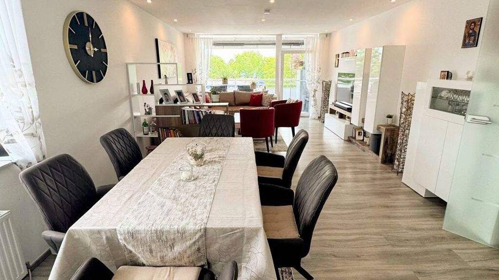 Beim Betreten erwartet Sie eine großzügige Diele mit großem Spiegelschrank und Garderobe. Das Herzstück der Wohnung ist das Wohnzimmer mit elektrischem Kamin, Essbereich und einer gemütlichen Couch-Ecke. Die angrenzende Terrasse lädt zu entspannten Stunden im Freien ein.