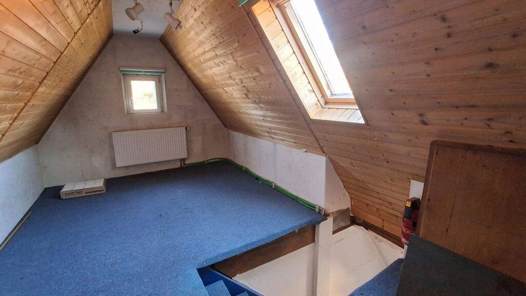 Im Erdgeschoss befindet sich ein separates WC und das Tageslichtbad mit Wanne und Dusche. Das ausgebaute Dachgeschoss ist in 2 Räume aufgeteilt. Der Dachboden ist größtenteils ausgebaut und kann vom Treppenhaus begangen werden. Er bietet weiteres Potential und zählt nicht zur hier angegebenen Wohnfläche von 80 qm. Der derzeit noch unausgebaute Dachbodenteil wurde als Lagerraum genutzt. Die Ölzentralheizung aus dem Jahr 1999, bei der der Brenner 2006 erneuert wurde befindet sich im teilunterkellerten Rest des Gebäudes.