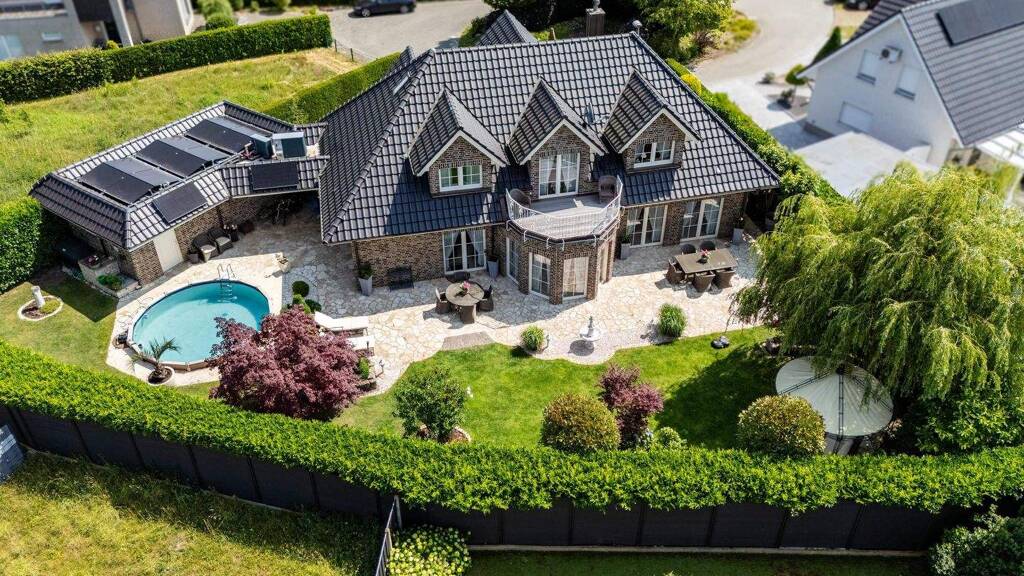 Genießen Sie den temperierbaren Pool oder entspannen Sie auf einer der zwei großzügigen Terrassen mit Polygonalpflasterung. Der Grill-Kamin mit Pizzaofen macht jeden Abend zum Event. Die automatische Bewässerungsanlage sorgt für einen stets gepflegten Garten, während der angebaute Gartenschuppen zusätzlichen Stauraum bietet.