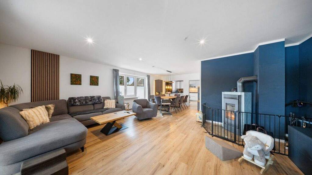 Der offene, lichtdurchflutete Wohnbereich bildet das Herzstück des Hauses. Ein Kamin sorgt für eine angenehme Wohnatmosphäre, während der angrenzende Wintergarten den Wohnraum erweitert und zu jeder Jahreszeit einen geschützten Rückzugsort bietet. Die moderne Küche mit neuen Elektrogeräten und einer Steinarbeitsplatte aus Nero Assoluto fügt sich funktional und stilvoll in den Grundriss ein.